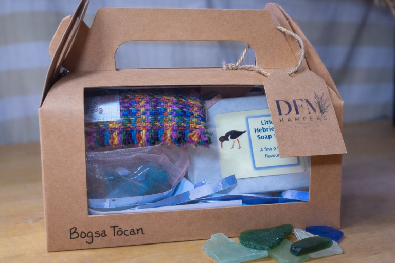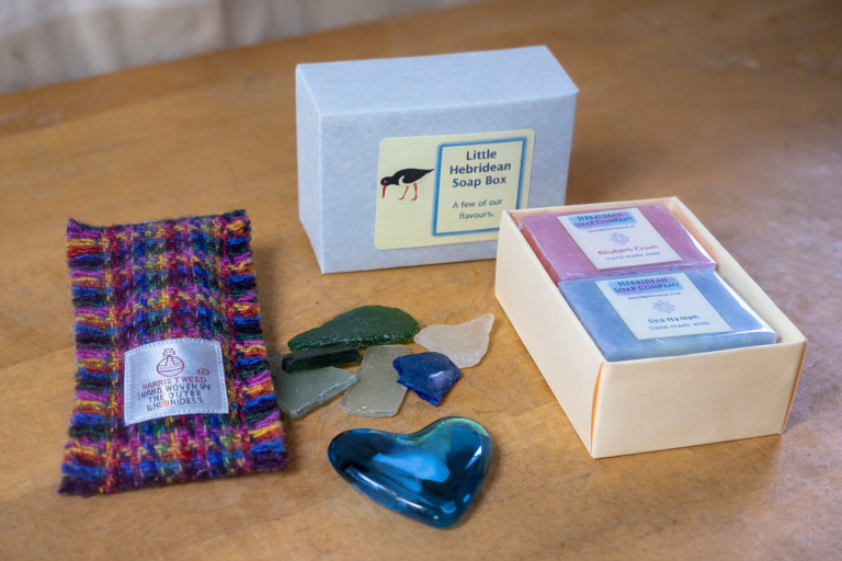 The first of our Bogsaichean Beaga is a very special wee box containing keepsakes and treats from the Isles of Harris & Lewis - four adorable mini assorted soaps in a beautiful hand-folded box by The Hebridean Soap Co, a Harris Tweed Keyring from Handmade by Heather, and an absolutely gorgeous little glass heart from the lovely Harris Glass.
